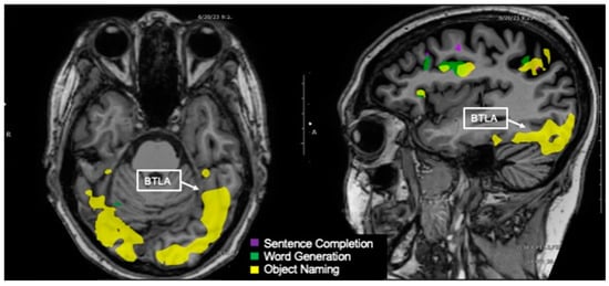 - Ashtari, M.; Perrine, K.; Elbaz, R.; Syed, U.; Thaden, E.; McIlree, C.; Dolgoff-Kaspar, R.; Clarke, T.; Diamond, A.; Ettinger, A. Mapping the Functional Anatomy of Sentence Comprehension and Application to Presurgical Evaluation of Patients with Brain Tumor. Am. J. Neuroradiol. 2005, 26, 1461–1468. [Google Scholar] [PubMed]