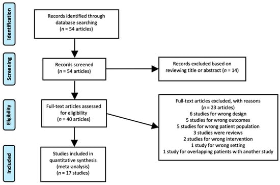 Fifty-four articles were reviewed individually against our inclusion criteria. Fourteen studies were omitted by reviewing the title or abstract. Full texts of the remaining 40 studies were reviewed, and 22 studies were excluded. As such, a total of 17 manuscripts, including 2252 patients, met the inclusion criteria and were used for data extraction (Figure 1 and Table 1). Two studies by Mena et al. [12,18] showed significant overlap, and only the later study with a greater number of cases was included in the meta-analysis to assess overall detection [12]. However, the smaller and earlier study published in 2020 [18] was used to calculate the pooled proportion of positive cases stratified based on the location of disease, the information of which was not provided in the larger study.