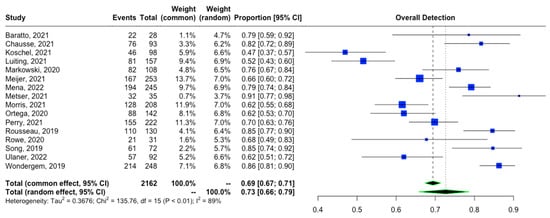 To evaluate the contribution of possible covariates in the heterogeneity, meta-regression analysis was performed with R version 4.2.2 using meta package version 6.0-0 for overall detection. Logit transformation with the inverse variance method was used to perform a meta-analysis of proportions. In addition, Funnel plots were used to assess publication bias. The overall quality of the studies was evaluated based on the revised “Quality Assessment of Diagnostic Accuracy Studies” tool (QUADAS-2) using Review Manager (RevMan) version 5.4 [17]. QUADAS-2 evaluates four domains (patient selection, index test, reference standard, and flow and timing), and each domain was assessed in terms of risk of bias. In addition, the first three domains were considered as a measure to check applicability. The reference standard was considered histopathologic correlation, and if the methods section of an included study clarified that at least some of the lesions were evaluated with pathology, the study was considered a low risk of bias for the reference standard. Otherwise, it was labeled as high risk for reference standards.