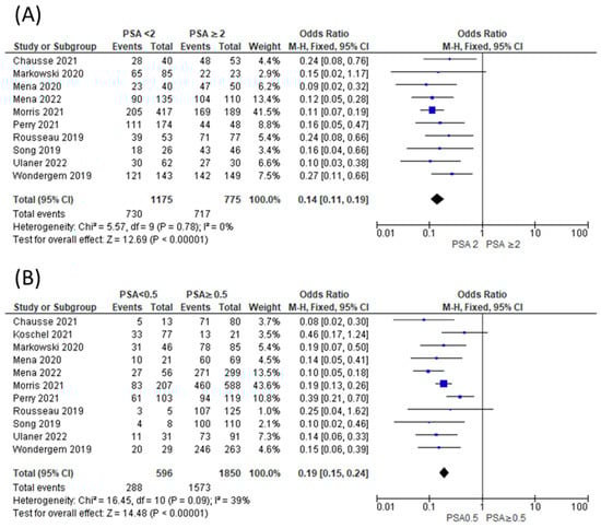 Comparison of proportion of patients showing positive [18F]DCFPyL scans among those with PSA < 2 compared to those with PSA ≥ 2 (A) [11,12,13,15,16,20,26,27,29] and among those with PSA < 0.5 versus PSA ≥ 0.5 (B) [11,12,13,15,16,20,21,26,27,29].