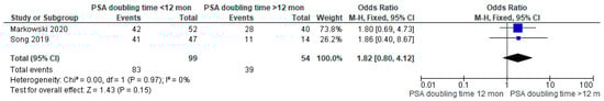 We also compared the pooled proportion of positive scans in two studies [15,16] according to PSA doubling time < 12 months versus those ≥ 12 months using Review Manager (RevMan) version 5.4. We performed the meta-analysis based on a random-effects model. I2 was calculated to quantify the heterogeneity.