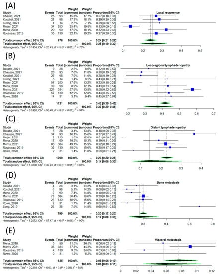 The detection rate of [18F]DCFPyL scan according to the site of disease, including local recurrence (A) [18,20,21,22,23,27], locoregional lymphadenopathy (B) [11,18,19,20,21,22,23,27,28], distant lymphadenopathy (C) [11,18,19,20,23,27,28], osseous metastases (D) [11,16,18,19,21,27,28], and visceral metastases (E) [18,20,21,22,23,27].