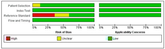 - Whiting, P.F.; Rutjes, A.W.; Westwood, M.E.; Mallett, S.; Deeks, J.J.; Reitsma, J.B.; Leeflang, M.M.G.; Sterne, J.A.C.; Bossuyt, P.M.M.; QUADAS-2 Group. QUADAS-2: A revised tool for the quality assessment of diagnostic accuracy studies. Ann. Intern. Med. 2011, 155, 529–536. [Google Scholar] [CrossRef]
