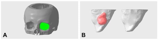 From patients with an isolated OFF, DICOM data from CT scans were imported from the study cohort into Mimics imaging software (Mimics Innovation Suite 21.0; Materialise, Leuven, Belgium) for further processing. In accordance with our preliminary work on the 3D measurement of OFFs, the CT images were color coded to separate the affected areas in the trauma zone as well as the orbit from the unaffected parts of the scanned midface [18]. The thresholding of Hounsfield units (HU) was performed for differentiation, as well as virtual tissue dissection using the mentioned software, so that the bony orbit was separated from the remaining skeletal elements. A separate working mask was used to manually close the bony orbital volume directly below the orbital floor and the defect (Figure 2A). In conclusion, a 3D model of the bony orbit was built and exported as an STL (Standard Triangle Language) file for 3D analysis.
