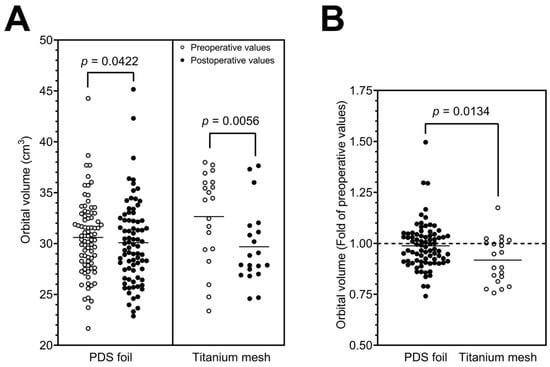 Regarding the orbital volume change, we demonstrated that the volume in restorations with PDS foils was reduced from an average of 30.60 cm3 to 30.09 cm3, thus indicating a 0.98-fold decrease. In contrast, restorations with titanium mesh reduced the orbital volume from an average of 32.65 cm3 to 29.69 cm3, representing a 0.91-fold reduction in the fractured orbit volume. The reduction in the orbital volume by insertion of a titanium mesh was statistically highly significant (p = 0.0056) in contrast to the volume change with a PDS foil (p = 0.0422), which was at the border of statistical significance. After subgrouping the study cohort according to Jaquiéry et al., it was shown that patients with a class II OFF were equally associated with a significant reduction in the orbital volume after restoration with titanium meshes or PDS foils (p = 0.0494 and p = 0.0342, respectively). In class III patients, however, only reconstructions with titanium meshes significantly reduced the orbital volume (p = 0.0312), which could be due to the size of the defect and the thickness of the mesh material. On average, the pre- and postoperative volumes showed a similar size range to those reported in previous studies [20,21].