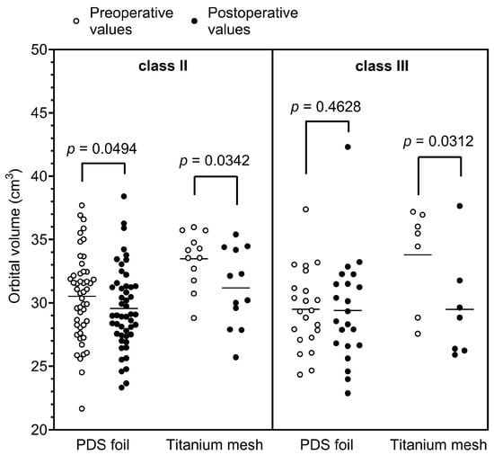 To evaluate the differences between the groups further, orbital volumes were calculated pre- and postoperatively in a subcohort of patients (study cohort; n = 104). When fractures were treated with PDS foil, the calculated preoperative orbital volumes had an average value of 30.60 cm3 with a standard deviation of 3.75 cm3 (minimum 21.66 cm3 and maximum 44.27 cm3), and the postoperative orbital volumes had an average value of 30.09 cm3 with a standard deviation of 4.07 cm3 (minimum 22.87 cm3 and maximum 45.16 cm3). In contrast, orbital floors restored with titanium mesh yielded an average preoperative volume of 32.65 cm3 with a standard deviation of 4.47 cm3 (minimum 23.38 cm3 and maximum 37.99 cm3) and an average postoperative volume of 29.69 cm3 with a standard deviation of 3.76 cm3 (minimum 24.59 cm3 and maximum 37.65 cm3). Here, the paired t-test revealed a highly statistically significant difference between the pre- and postoperatively measured volumes for restorations with titanium meshes (p = 0.0056, Figure 4A; Table 2) and a statistically significant difference for restorations with PDS foils (p = 0.0422, Figure 4A; Table 2). Figure 3B shows a representative example of the segmented preoperative and postoperative orbital volume, volume reduction, and restoration of the defect using a PDS foil. To further investigate the aspect of volume reduction with the respective surgically placed material, the fold of the preoperative orbital volume was calculated for each individual patient. This calculation revealed a 0.98-fold difference between the post- and preoperative measurements for restorations with PDS foils (SD: 1.14-fold; minimum 1.06-fold and maximum 1.02-fold). Restorations with titanium meshes showed a 0.91-fold difference between post- and preoperative measurements (SD: 0.84-fold; minimum 1.05-fold and maximum 0.99-fold). The folds of preoperative orbital volumes were significantly different (p = 0.0134; Figure 4B). In summary, these data demonstrate that orbital volumes are more reduced when titanium meshes are used than when PDS foils are used. All results are presented in Table 2. To further validate these results, subgroups were divided according to the classification of Jaquiéry et al., and analyzed [19]. Most patients belonged to class II or class III; thus, all patients had a defect of the orbital floor and/or of the medial wall with fracture areas larger than 2 cm2. The difference between class II and III is that the bony ledge is preserved at the medial margin of the infraorbital fissure in class II patients, and the bony ledge is missing medial to the infraorbital fissure in class III patients. In class II patients, postoperative orbital volume values were significantly decreased for PDS foils and titanium meshes in a comparable manner (p = 0.0494 and p = 0.0342, respectively, Figure 5). In class III patients, there was no significant reduction in orbital volumes with regards to PDS foils; however, a significant reduction was observed with regards to titanium meshes (p = 0.0312, Figure 5). These results indicate that patients with a missing bony ledge medial to the infraorbital fissure benefit from reconstruction with PDS foils due to smaller reduction in orbital volumes.