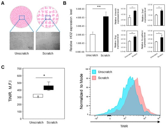 Expression of HO2 mRNA in the different culture conditions of A549 cells. (A) Representative cell microscope image (×4) of the experimental concept. The cells were scratched to check the expression pattern of HO2 in the migratory cancer cells. (B) HO2 and migration marker mRNA levels were confirmed by qPCR. (C) TiNIR staining pattern in the migrating cancer cell. Each cell was stained by TiNIR (100 nM, 37 °C) for 30 min and destained with PBS for 2 h. Fluorescence intensity was measured by flow cytometry. Data are presented as the mean ± SD from three independent experiments. (p-values were determined by t-test, p * < 0.05, p ** < 0.01 versus the unscratched cells).