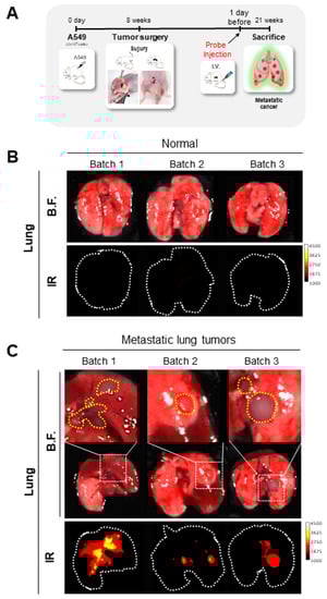 Ex vivo tracking metastatic lung tumors. (A) The schematic procedure of the experiment for tracking metastatic lung tumors by TiNIR. TiNIR was injected into the tail vein of the normal group and the metastatic cancer mouse model (100 μM, 100 μL/10 g) 1 day before sacrifice. TiNIR signals were detected on the infrared (IR) long channel (810–850 nm) from (B) the normal lung group and (C) the metastatic lung tumor group.