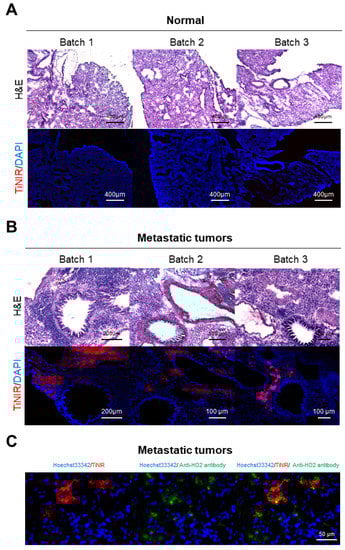 Histological analysis of the lungs from the TiNIR-injected normal group (A) and the metastatic cancer mouse (B). The lung tissues were stained by H&E to confirm the generation of the tumor (upper). (C) Confirming co-localization of the TiNIR signal with the HO2 antibody. The TiNIR-injected mouse lung tissue was stained by an HO2 antibody (Alexa-488). Images were analyzed by EVOS 7000 microscope with a ×20 (H&E) and ×40 (fluorescence) air objective.