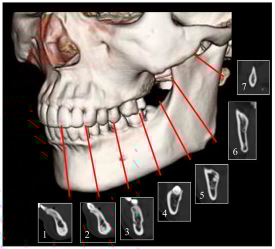 The variables studied were age, sex, height, weight, and the number of remaining teeth in the mandible. The CT examinations were performed using a SOMATOM Definition AS (Siemens Healthcare, Erlangen, Germany). The acquisition protocol included the following imaging parameters: tube voltage of 120 kV, tube current of 100 mA, tube rotation time of 0.50 s, pitch of 0.8, slice thickness of 0.625 mm, matrix of 512 × 512, and DFOV of 150 mm. Images were analysed using radiograph display software (AquariusNET Viewer; Ter-aRecon, Durham, NC, USA) to measure the thickness of the mandible on one side. Typically, in mandibular reconstruction, a titanium fixation plate is placed at the stress concentration site, defined as the compression zone of the mandible due to occlusion, and then fixed with bicortical screws. In this study, the mandibular thickness was measured at the following points: 5–7 mm above the inferior margin of the mandible, where screws are clinically placed for such load-bearing fixation: (1) mandibular symphysis; (2) midpoint between the mandibular symphysis and mental foramen; (3) mental foramen; (4) midpoint between the mental foramen and antegonial notch; (5) antegonial notch; (6) mandibular angular apex (gonion); and (7) neck lateral border of the dentate cartilage (Figure 1).