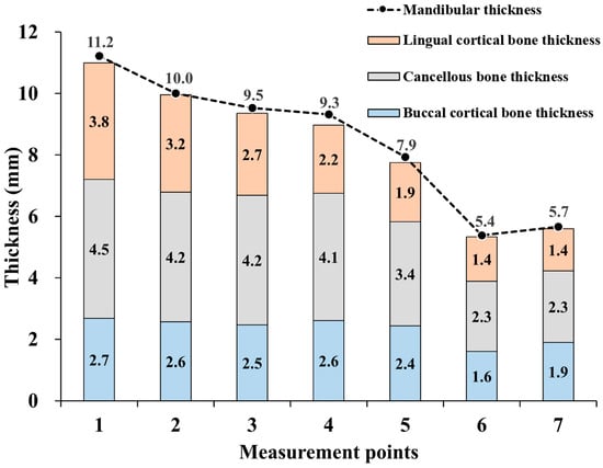 The thickness of the mandible at each measurement point. Median thickness of the mandible plus its components: buccal, trabecular, and lingual cortical bone.