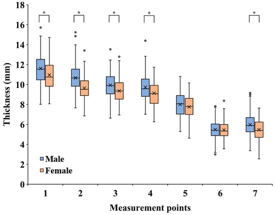 Regarding the relationship between mandibular thickness and sex (Figure 4), females had a smaller mandibular thickness than males at all measurement points. Points 1, 2, 3, 4, and 7 showed significant differences (p < 0.001). Age and the number of remaining teeth in the mandible did not correlate with mandibular thickness. However, height and weight correlated with mandibular thickness at all points except point 6 (Table 2).