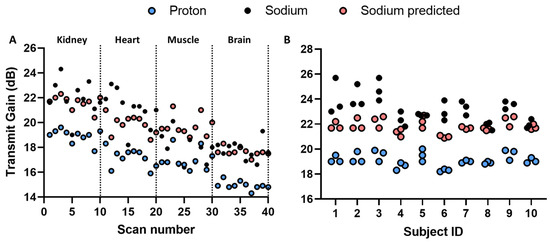 All data points from the Site A sodium TGs comparison are shown in Figure 2. A decrease in the proton and sodium transmit gain in organs from the kidney to the brain can be seen, which corresponds to the decrease in loading. This is seen in both the acquired and predicted data. The predicted sodium transmit gain is significantly lower than the prescribed values in the heart (p = 0.04) and higher in the thigh muscle (p = 0.001). No significant difference was determined in the brain and kidney.