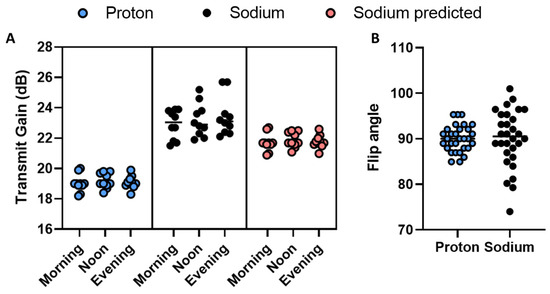 (A) Circadian measured and predicted proton and sodium transmit gain on a group level. (B) Actual flip angle spread of proton and sodium circadian measurements.