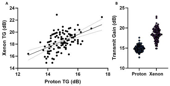 The R-squared value was 0.27, and the p-value was below 0.001. As with sodium, we evaluated the transmit gain variation of the proton and xenon (Figure 4B). The results show a significantly (p < 0.001) smaller variation in the proton TG (14.9 ± 0.8 dB) compared to the xenon TG (18.4 ± 1.5 dB), indicating the TG measurement for the proton to be a more robust measure than for xenon. By using the proton TG to determine the xenon TG, we can calculate the mean percentage relative difference in TG (for measurement vs. prediction) as follows: