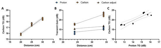 Results from the Carbon-Proton phantom study are shown in Figure 5. The results display a mean value increase in the proton and carbon TG according to loading from 13.3 to 15.3 dB and 17.7 to 20.9 dB, respectively (Figure 5B). The transmit field varies across the distance between the Helmholtz loop coil elements in a manner that can be analytically known in detail [23]. Near the centre of the coil, the transmit field changes slowly as the first, second, and third derivatives of the spatial field are zero. Beyond this point, homogeneity is analytically approximated well by a first-order Taylor series [23]. This was estimated by determining the TG for a carbon point phantom at distances from 20 cm to 30 cm in increments of 5 cm (Figure 5A). Secondly, the TG changes were measured for the proton (head and body loading phantom) and the carbon (DSP) at 24 and 34 cm coil element distances (see Figure A1). The unadjusted linear relationship between the proton and carbon transmit gain, based on loading, was found via linear regression (CarbonTG = 2.045 ∙ ProtonTG − 8.949, R2 = 0.81, p-value = 0.0004) (Figure 5C). Changing the loading to distance provides a linear relationship between the transmit gain and distance as shown in Figure 5A,B.
