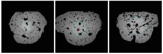 Figure 1 demonstrates the ablation margins (turquoise) and carbonisation margins (red) in the T1-weighted MRI of the liver. A higher-quality resolution to showcase carbonisation is available below. All three liver tissue samples feature homogenous fluid diffusion throughout the tissue, which confirms a successful infusion of the cooling fluid. Ablation margins are highlighted in turquoise. All three ablation margins are smooth and in a near-spherical shape. The left figure depicts a non-carbonised ablation margin when distilled water was infused. It is comparatively smaller than the other two ablation volumes. The middle figure has a comparatively larger ablation margin but also shows a margin of carbonisation, which is highlighted in red. This is a sample where 0.9% saline was infused during ablation. The right figure illustrates a tissue sample where the 50/50 mixture of 0.9% saline and distilled water was infused during ablation. Its ablation margin is again comparatively larger, and there is no carbonisation.
