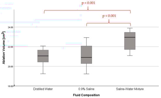 Additionally, while statistical significance is present, the difference is comparatively small (Figure 3). As such, we cannot conclude that a mixture of 0.9% saline and distilled water is optimal for hyperthermic ablation, merely that it is slightly better than the current status quo. Despite this, the presence of statistical significance confers that cooling fluid composition has a relevant effect on ablation volume.
