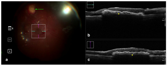 Rescan 700 iOCT showing a case of RRD after perfluorocarbon flattening. On the left is the en face ophthalmoscopic surgical view with a digital overlay indicating the scanning area (a) and in the upper and lower right portions of the image are the horizontal and vertical scans, respectively (b,c). The iOCT shows the surgeon the successful reattachment of the retina, although with persistence of subfoveal fluid (yellow asterisk) and the presence of outer retinal folds (green arrows) Abbreviations: iOCT, intraoperative optical coherence tomography; RRD, rhegmatogenous retinal detachment.
