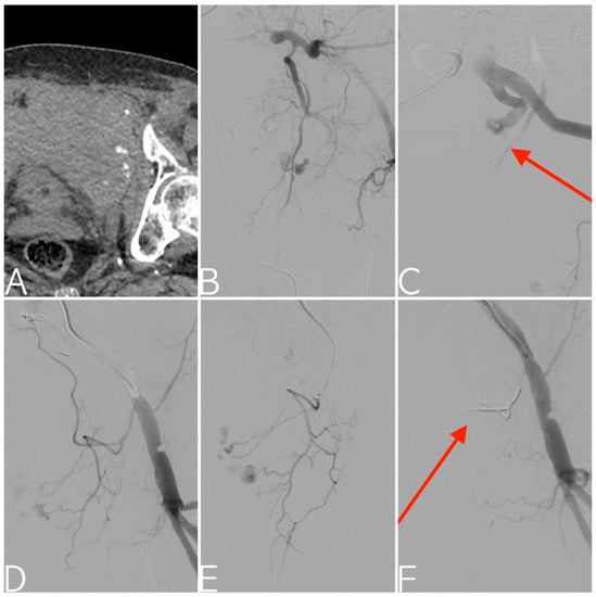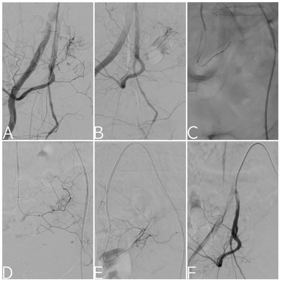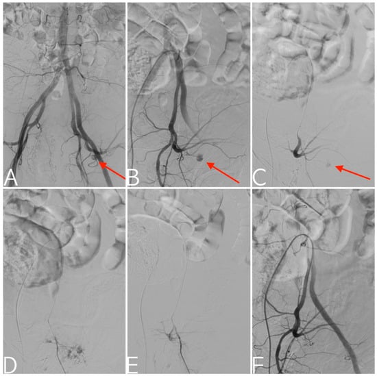 Selective digital subtraction angiography of the right internal iliac artery: bleeding from the lateral sacral arteries noted (A,B). Fluoroscopy image depicting superselective catheterization of the target vessel with 2.4 Fr microcatheter and 0.018” guidewire (C). Angiograms confirming bleeding from the lateral sacral arteries (D,E), treated via targeted embolization with a gelatin sponge. Final angiogram demonstrating technical success with exclusion of arterial injury from circulation (F).