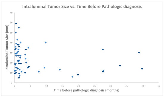 | Time before Pathologic Diagnosis (Months) | No. of Imaging Studies | Wall Thickening | Wall Enhancement | Intraluminal Mass | Intramural Mass | Extramural Mass |
