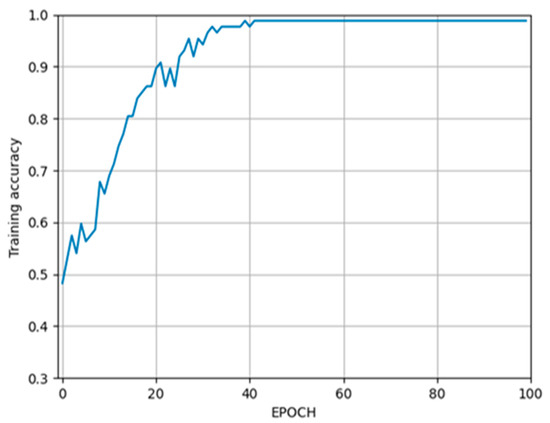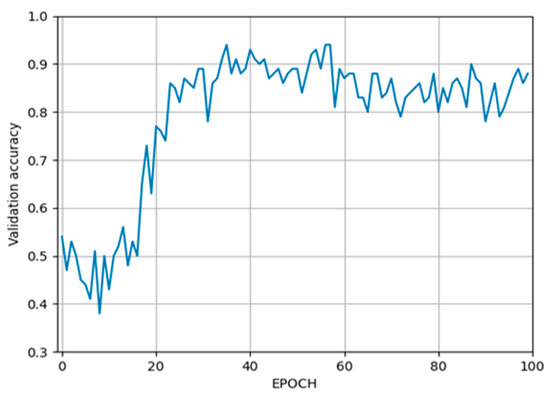 In the first stage, a classification network was created based on ResNet-101 to detect the correct slice from the CBCT scan where the whole mandibular canal is visible. The maximum accuracy (98.85%) of the training process was reached at the 39th epoch, which is plotted in Figure 6, while the accuracy of the validation process (93.99%) was reached at the 35th epoch, which is plotted in Figure 7.
