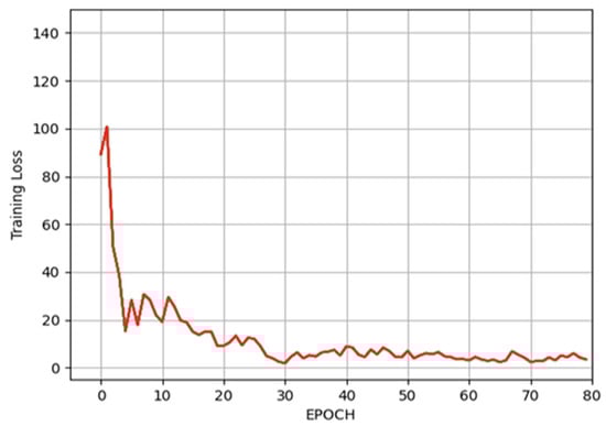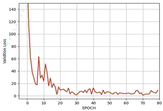 In the second stage, a regression network based on ResNet-101 was created and trained to draw a line across the mandibular bone based on five points, and then, another line was drawn between two points which intersect the canal itself. The minimum L1 loss (showing how close the real points are to the estimated ones) of the training process reached 1.86 pixels (px) at the 30th epoch, which is plotted in Figure 8, while the minimum loss of the validation process reached 1.02 pixels at the 70th epoch, which is plotted in Figure 9.