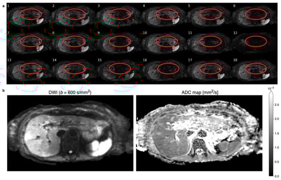 Diffusion-weighted (DW) magnetic resonance imaging (MRI) [,] depicts tissue microstructure through probing the molecular diffusion process []. It has crucial, established applications in brain imaging, both in neuroscience and neurological imaging [,,,]. Translation of diffusion-weighted imaging (DWI) to the body is desirable and has been performed in multiple organs including the liver [,,,]. In the liver, DWI has been shown to be useful for the detection and characterization of focal hepatic lesions [,,], for the assessment of treatment response [,], and for the evaluation of diffuse liver disease [,].