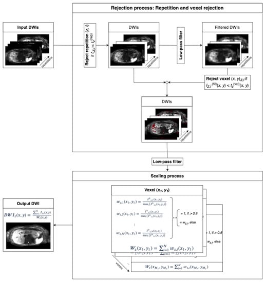 The two-step algorithm takes repetitions of one slice and one b-value as input. DW images in different directions are treated as additional repetitions. The sum of intensities of all voxels in each repetition is compared to a threshold for repetition rejection. Subsequent low-pass filtering blurs the images to consider that motion artifacts tend to affect patches of the image in the voxel rejection step. Spatially dependent thresholding on the filtered images determines whether a voxel is rejected. The spatially dependent weights are computed on low-pass-filtered data by dividing the intensity of each repetition by the maximum intensity projection across all repetitions. Weights that exceed a value of 0.8 are set to 1. The resulting DW image is found by scaling the sum across repetitions of the magnitude of non-rejected voxels with the spatially dependent scaling factor according to Equation (4).