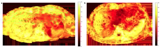 The diffusion-weighted images at the b-value of and ADC maps from the standard and proposed methods with the weight map of Figure 5a applied are shown in Figure 6a. The left liver lobe appears brighter, and ADC overestimation is reduced. A second example case in Figure 6b illustrates the algorithm’s ability to mitigate the motion-induced signal loss in the left liver. With spatial scaling, the liver is more homogeneous in both the diffusion-weighted image and the ADC map. The reduction in signal loss appearance in the DW image gives better delineation of the lesion inside the left liver lobe.