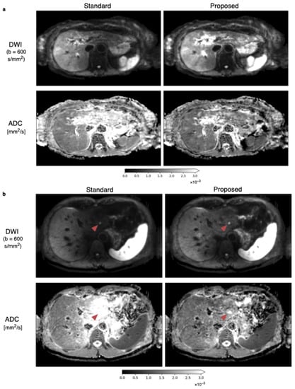 - Chen, X.; Qin, L.; Pan, D.; Huang, Y.; Yan, L.; Wang, G.; Liu, Y.; Liang, C.; Liu, Z. Liver diffusion-weighted MR imaging: Reproducibility comparison of ADC measurements obtained with multiple breath-hold, free-breathing, respiratory-triggered, and navigator-triggered techniques. Radiology 2014, 271, 113–125. [Google Scholar] [CrossRef] [PubMed]