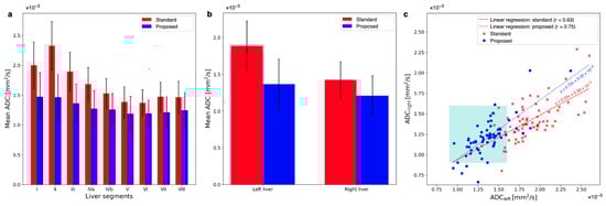 (a) A comparison of ADCs in the nine Couinaud liver segments reveals that ADCs in segments I, II, and III are overestimated the most, but they also they show the greatest correction to lower values after using the proposed method. ADCs of the segments of the right liver experience smaller changes toward lower values after using the proposed method, although they are significant. (b) The average ADC for all patients in the left liver is reduced by 38.2%, while in the right liver, the reduction is only 17.6%. This results in a more homogeneous liver appearance using the proposed method: with an ADC liver lobe ratio (ALR) of 1.13 ± 0.53 for the proposed method but 1.33 ± 0.47 for the standard method. (c) The comparison between left and right liver is plotted for all patients. The cohort of ADCs from the proposed method is notably more dense and shifted towards the lower left corner and inside the cyan square that indicates the range of ADCs of healthy liver parenchyma. Linear regression of both these cohorts yields a steeper slope that is closer to 1 for the ADCs using the proposed method.