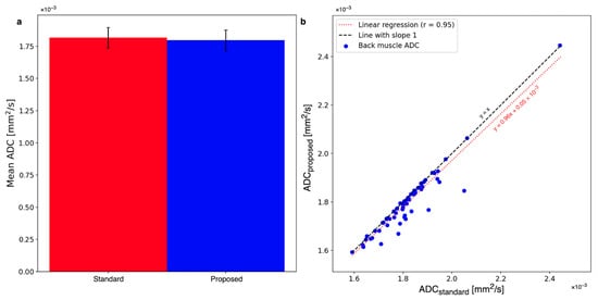 (a) The mean ADC in the back muscle changes from mm2/s to mm2/s. The change is statistically insignificant. (b) The shift towards smaller ADCs can also be observed when comparing the whole cohort of patients with standard averaging and the proposed method. The linear regression of the plot has a slope of 0.96.