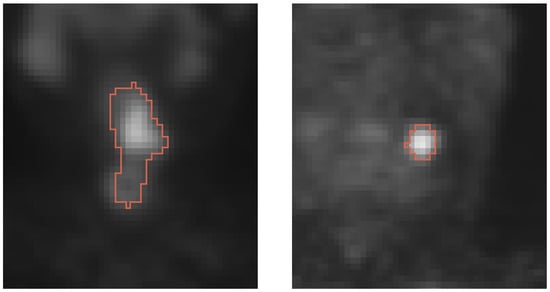Figure 11 and Figure 12 depict typical cases of a primary and secondary lesion segmentation, respectively. In addition, Figure 13 and Figure 14 show poorly performing cases of primary and secondary lesion segmentation, respectively. Note that the lesions in good performing cases tend to have a larger size and better contrast.