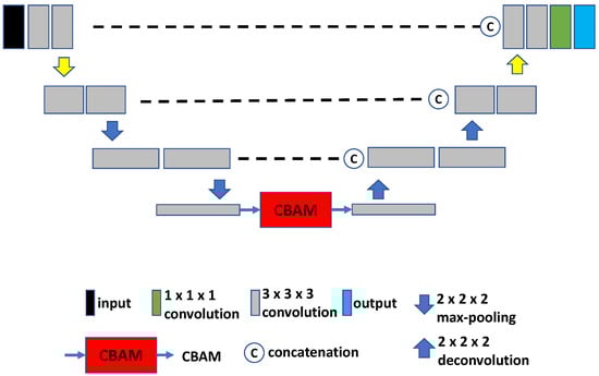 Research on U-Net-based combined localization and segmentation has demonstrated that the bottleneck of the U-Net contains useful information for image interpretation [26]. Motivated by this insight, Xiong [27] proposed to integrate a CBAM module, consisting of a spatial and channel attention module, into a 3D U-Net architecture for the purpose of head and neck lesion segmentation in volumetric PET images. This network is depicted in Figure 3 and is referred to as U-Net-CBAM.