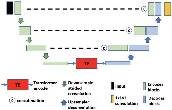- TransBTS. The core idea of TransBTS [30] (Figure 4) is to replace the bottleneck part of the 3D U-Net with a set of Transformer encoders to model the long-distance dependency in a global space [30]. The contraction–expansion structure from the U-Net is mainly utilized because splitting the data into 3D patches following the ViT makes the model unable to capture the local context information across the whole spatial and depth dimensions for volumetric segmentation. Using convolution blocks with downsampling before the Transformer encoder allows it to learn long-range correlations with a global receptive field with relatively small computational complexity.