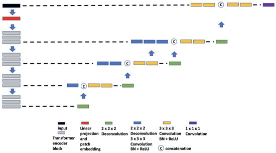 - UNETR. UNETR (Figure 5), proposed by Hatamizadeh et al. [31], is another example of the combination of CNN and ViT. In contrast to TransBTS, UNETR does not use convolution blocks and downsampling to reduce the feature size of the whole data; instead, it splits the data into 3D volume patches and then employs the Transformer as the main encoder and connects it directly to the decoder via skip connections. More specifically, as shown by Hatamizadeh et al. [31], feature representations are extracted from several different layers of the Transformer decoder and reshaped and projected from the embedding space into the input space via deconvolutional and convolutional layers. At the last Transformer layer, a deconvolutional layer is applied to upsample the feature map size by 2, and then it is concatenated with the projected Transformer output from the upper tier. The concatenated feature map is fed to consecutive convolutional layers and subsequently upsampled with a deconvolutional layer. The process is repeated until the original input resolution is reached.