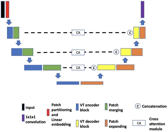 - VT-UNet. The VT-UNet (Figure 6) proposed by Peiris et al. [32] also built on the encoder–decoder-based U-Net architecture. However, instead of trying to combine the CNN with Transformers like TransBTS and UNETR, VT-UNet is purely based on Transformers. This is achieved by two specially-designed Transformer blocks. In the encoder, a hierarchical Transformer block is used to capture both local and global information. It is similar to Swin Transformer blocks [33]. In the decoder, a parallel cross-attention and self-attention module is utilized. It enables creating a bridge between queries from the decoder and keys/values from the encoder. This architecture enables preserving global information during the decoding process [32]. More specifically, the Swin Transformer-based encoder expands the original 2D Swin Transformer to create a hierarchical representation of the 3D input by starting from small volume patches, which are gradually merged with neighboring patches in deeper Transformer layers. Then, the linear computational complexity with input size is achieved by computing SA locally within non-overlapping windows that partition an input. In addition, a shift of the window partition between consecutive SA layers provides connections among windows and significantly enhances the model power [33]. The idea of parallelization in the decoder is to mimic the skip connections in the U-Net and serve the same purpose, enabling a connection between lower-level spatial features from lower layers and higher-level semantic features from upper layers.