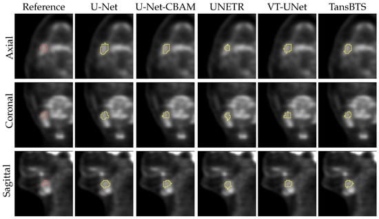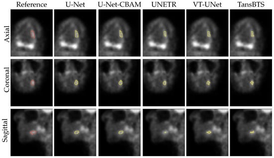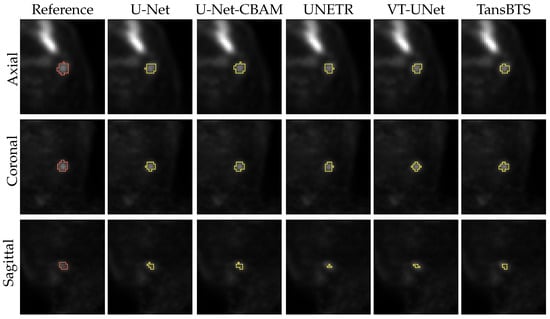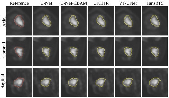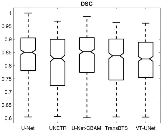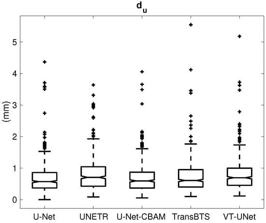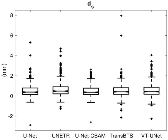Table 1 provides the percentage of segmentations that were deemed as successful and failed. For all successful cases, Table 2 summarizes the performance metrics for all five segmentation approaches. In addition, corresponding box plots of DSC, and are depicted in Figure 7, Figure 8 and Figure 9, respectively. As can be seen in Figure 7, medians as well as first- and third-quartile levels are lower for Transformer-based approaches when compared to U-Net variants. Based on the results for the Dice coefficient, the networks were compared to assess the statistical significance of differences. The U-Net-CBAM approach (good trade-off between DSC and percentage of successful segmentations) performed significantly better () than UNETR () and VT-UNet (). By contrast, the comparisons with U-Net () and TransBTS () were not found to be significant. Differences in the unsigned and signed distances were not statistically significant (). All five approaches showed a segmentation bias with the tendency to produce larger segmentations compared to the reference standard.