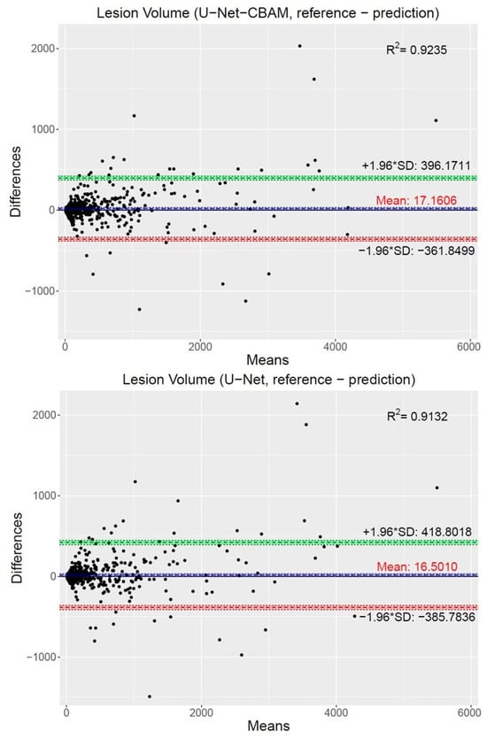 Furthermore, we assessed the impact of lesion volume on the segmentation behavior of the top two performing networks using all segmentation results (i.e., failed and successful cases). For this purpose, the volumes of lesion segmentations generated by the U-NET and U-Net-CBAM approaches were compared to the independent reference standard by using Bland–Altman plots (Figure 10). Specifically, for each reference and generated segmentation pair, the means of the two measurements were assigned to the x-axis, and the difference between reference and prediction was assigned to the y-axis. Both methods show a bias, which is mainly driven by outliers (failed segmentations). The confidence intervals are tighter for the U-Net-CBAM approach compared to the standard U-Net. Also, R-squared () values are provided to assess the goodness-of-fit between segmentation and reference volumes (Figure 10), indicating a better fit for the U-Net-CBAM.