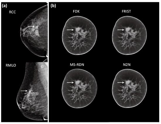 An example showing a soft tissue lesion (arrows) in the right breast (a) digital mammography and (b) BCT. Five-slice averages from all four BCT image reconstruction algorithms are shown with display window of [0.21, 0.33] cm−1 (in units of linear attenuation coefficient). Subsequent to imaging, the lesion was biopsied and was pathology-verified as invasive ductal carcinoma.