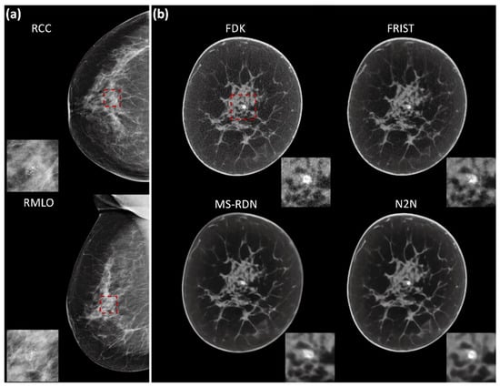 The major advantage of these advanced image reconstruction algorithms is the ability to denoise the image without degrading its quality. This would allow for the reduction of the radiation dose so that BCT would be suitable for screening. For linear reconstruction algorithms, the achievable dose reduction can be computed from the image variance. However, for non-linear reconstruction algorithms such as the FRIST, MS-RDN, and N2N studied here, the achievable dose reduction cannot be directly estimated from the image variance. Hence, the dose reductions achievable with each of these algorithms are discussed below.