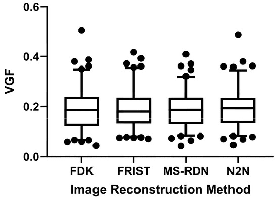 The distribution of VGF from each of the four image reconstructions did not satisfy the normality assumption (p < 0.021, Shapiro–Wilk’s test). Hence, the median, IQR, and range of the VGF are summarized in Table 2. For the standard FDK reconstruction, the median, IQR, and range of the VGF were 0.186, (0.122, 0.239), and [0.04–0.505], respectively. For the matched datasets, the VGF did not differ significantly among the four reconstructions (p = 0.167, Friedman’s test). Also, the VGF from the advanced image reconstruction algorithms did not differ from the standard FDK reconstruction (p > 0.862, Dunn’s multiple comparisons test). The p-values for the comparison between the advanced image reconstruction methods and the standard FDK reconstruction are included in Table 2. Figure 5 shows the box plot of the VGF from the four reconstruction methods. The box ends represent the IQR, the central line within the box represents the median, and the whiskers represent the 5–95% of the VGF distribution.