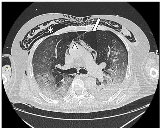 Axial chest CT image of a 62-year-old male with COVID-19 pneumonia (Group 1), who developed pneumothorax (arrow), pneumomediastinum (arrowhead) and extensive subcutaneous emphysema (asterisk). The patient had a Brixia score of 14 at ER, 1 day of NIV prior to intubation and a SOFA score of 11 at ICU admission. The patient died during ICU hospitalization.