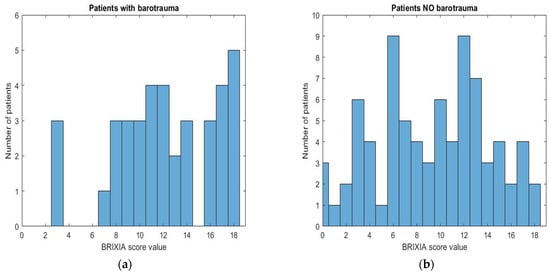 A preliminary analysis was performed assessing the distribution of BS values for both sample groups. Plotting the BS data of the Brixia scores, the histograms shown in Figure 2 were obtained: among patients with barotrauma the BS values are higher than those recorded patients without barotrauma (mean 12.18 vs. 9.28). Statistical indices regarding the distribution of the BS are summarized in Table 3.