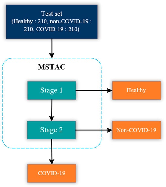 - The proposed MSTAC model stacks stage-1 and stage-2. This stacking allows MSTAC to identify three classes of CXR images: COVID-19, non-COVID-19, and healthy.