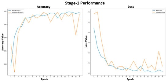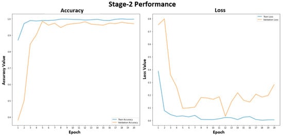 Figure 5 shows the training and validation performance of the stage-1 model. The stage-1 model was trained with 20 epochs to classify healthy and unhealthy CXR images. The training accuracy was stable at 99.2% after epoch 15. The training and validation losses were similar, representing a good fit for the stage-1 model, and were not overfitted. In Figure 6, the accuracy plot of the stage-2 model shows a good training and validation trend. Despite a slight difference in the gap between the training and validation curves in both accuracy and loss plots, this indicates that the stage-2 model is effective. It is effective in distinguishing between COVID-19 and non-COVID-19 CXR images. The results of the combined stage-1 and stage-2 models are showcased in MSTAC, as depicted in Figure 3. To assess the performance of MSTAC and CNN-Multiclass, a set of 630 CXR images was utilized. The training and validation results, displayed in the figures, suggest the efficacy of the proposed multi-stage approach in classifying different health conditions in CXR images.