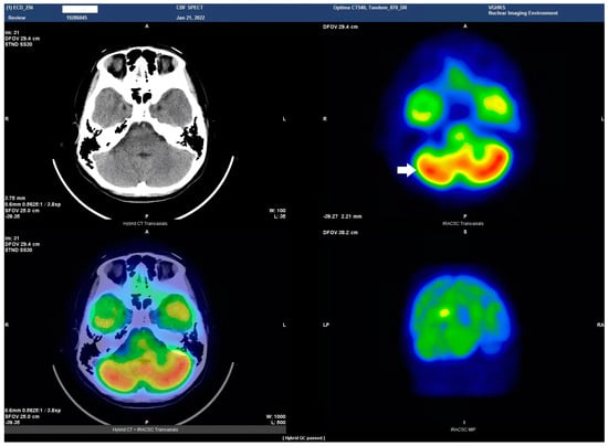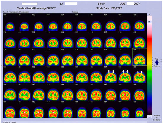 Tc−99m ECD SPECT stands as a pivotal non-invasive diagnostic tool in the realm of neurological assessment [], primarily chosen for its exceptional ability to evaluate brain blood perfusion. We employed a radiotracer, Tc-99m ECD, which is taken up by the brain’s vascular system and reflects regional cerebral blood flow (rCBF) []. SPECT imaging captures gamma rays emitted by the radiopharmaceutical, providing a 3D representation of blood perfusion in the brain. Unlike conventional anatomical imaging methods such as CT or MRI, Tc−99m ECD SPECT provides functional insights into the brain, offering a unique window into cerebral activity. What makes it particularly invaluable is its high sensitivity to changes in blood flow, enabling the detection of even subtle alterations, a feature crucial in diagnosing conditions affecting cerebral perfusion, including stroke, vascular disorders, and neurodegenerative diseases [].