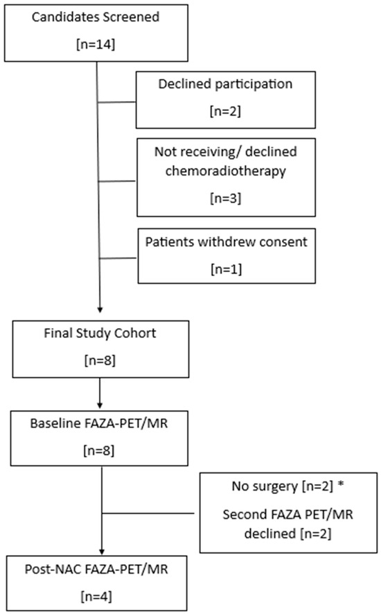 There were 14 patients screened for the trial over a 26-month period (see patient flowchart in Figure 2), with 8 consenting patients with locally advanced adenocarcinoma of the rectum who underwent baseline 18F-FAZA PET/MR. All patients were men with a mean age of 64.3 years (range: 45–76). Of these, four patients also completed 18F-FAZA PET/MR following chemoradiotherapy. Demographic data, including clinical and surgical stage, pathology regression grade, and clinical outcome data, are depicted in Table 1. In Table 2, tumor volume, SUVmax, and SUVmean (±SD) for tumor and reference regions are presented. Following chemoradiotherapy, tumor volume decreased by an average of 69.8% (from baseline to follow-up).