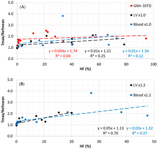 At the threshold of ×1.0, the Pearson correlation between TRR and HF was the strongest for the LV reference (R = 0.499; p-value = 0.09) over other references and followed by the BP reference (R = 0.344; p-value = 0.29). Meanwhile, a weak correlation between HF and TRR for GMc was measured to be R = 0.241, p-value = 0.45. For threshold ×1.2, the correlation for LV was statistically significantly strong (R = 0.837; p-value = 0.0007) in comparison to a moderate correlation for BP reference (R = 0.61; p-value = 0.035). These results suggest that at ×1.2 threshold, the LV as a reference is more stable to represent the HF.